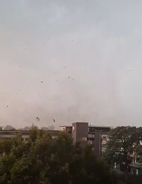 De passerende windhoos vanaf een balkon gefilmd. Via Glenda van Oorschot.