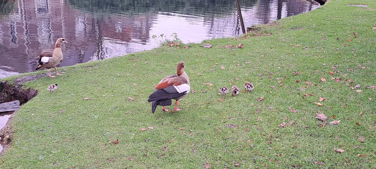 En dan die voortplanting. Hoewel de broedtijd meestal van eind maart tot eind mei is, kunnen nijlganzen het hele jaar broeden. En dus ook middenin de winter. Ik herinner me nog hoe we ooit in het Sonsbeekpark in Arnhem, in februari, terwijl het vroor en met ijs op het water, een moedige nijlgans met een rij pulletjes erachter tegenkwamen. Het stel zocht een rustige plek, uit de koude wind. Het broedsucces van de vogel is daarmee wel verklaard.