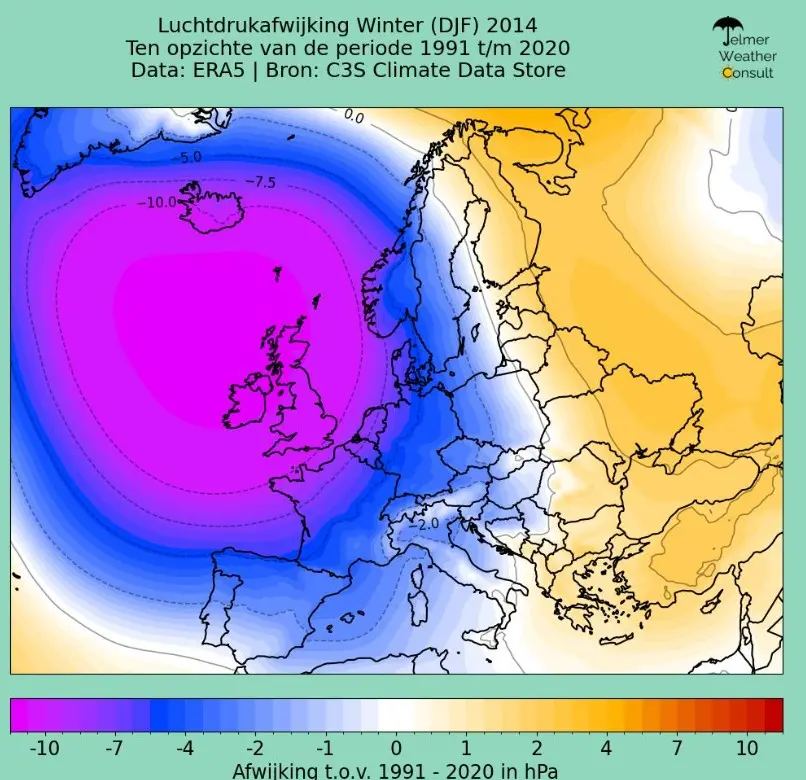 Reinout van den BornDe enige winter waarin het koudegetal in De Bilt op nul eindigde, blijft ook na de huidige die van 2014. Het was een winter waarin de wind niet uit de zuidhoek weg te krijgen was. Winterweer ontbrak in alle drie de wintermaanden vrijwel volledig.