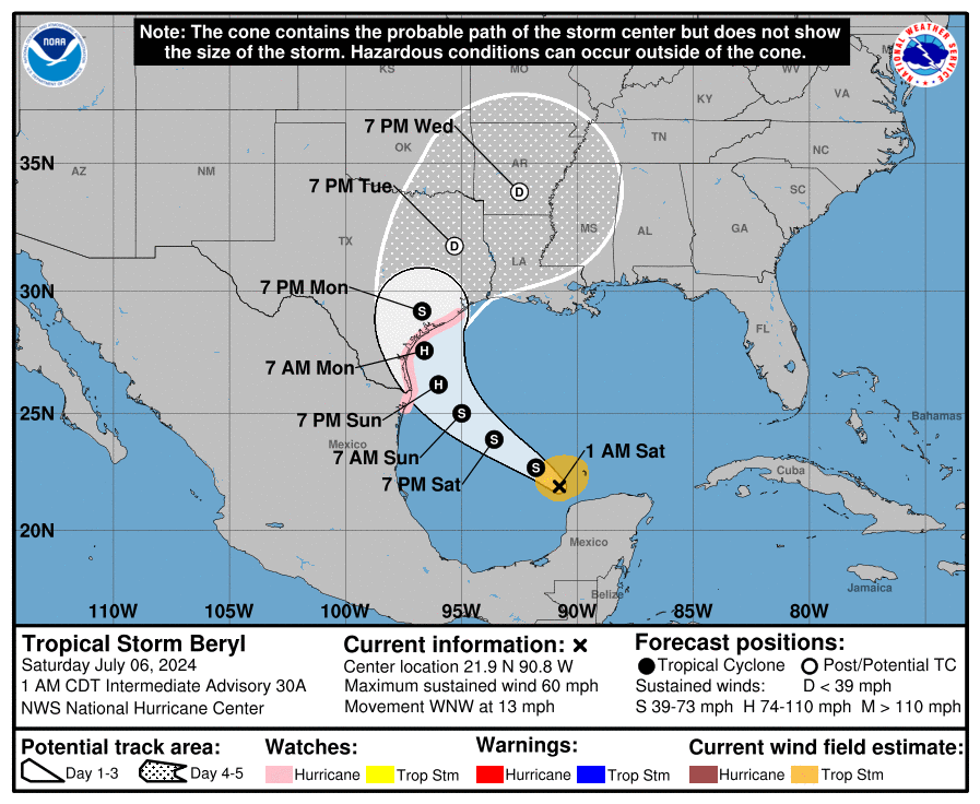 Hoe sterk de dan weer orkaan zal zijn op het moment dat ze in Texas het land op komt, is nu nog niet helemaal duidelijk. Volgens de officiële verwachting van het National Hurricane Center heeft Beryl dan haar orkaanstatus wel lang en breed terug, met windsnelheden tot 150 kilometer per uur rond de kern. En dat zou in het slechtste geval ook nog best wel meer kunnen zijn. De inwoners van de gebieden in Texas dichtbij de kust, die waarschijnlijk met de invloed van de naderende storm te maken zullen gaan krijgen, zijn dan ook gewaarschuwd dat ze waarschijnlijk op de gevolgen van een volwassen orkaan moeten rekenen.