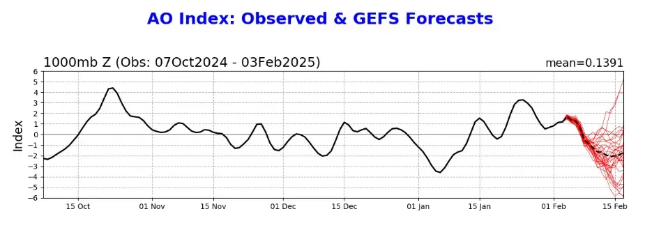 Een reactie hierop is de vorming van een hogedrukgebied binnen de poolcirkel. Je ziet dit mooi in de verwachte AO-index voor de komende tijd terug. Die index geeft een beeld van de drukverdeling binnen de poolcirkel. Is hogedruk er dominant, dan wordt de AO-index sterk negatief. Is lagedruk er dominant, dan wordt de AO-index sterk positief.