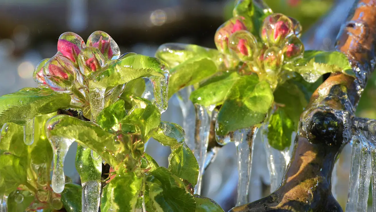 Zo isoleert het ijs de takken en dat zorgt ervoor dat kou uit de buitenlucht de knoppen niet kan bereiken. De temperatuur onder het ijslaagje is nul graden en dat is net warm genoeg om geen schade te veroorzaken. Het jasje beschermt dus de knoppen en bloesem tegen vrieskou.